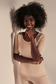 Bluzka jest wykonana z materiału ściągaczowego o ciekawej fakturze. Materiał jest bardzo elastyczny, dopasowuje się do kształtu ciała, dlatego każda sylwetka będzie się w nim czuła komfortowo. Design jest minimalistyczny. Bluzka pasuje właściwie do wszystkiego. Bluzka uszyta jest z naszej flagowej dzianiny prążkowanej, która nas wyróżnia. Jest ona bardzo elastyczna, a przy tym mięsista. Wierzchnia strona dzianiny posiada delikatny meszek, bardzo miły w dotyku. Zjawisko mechacenia zostało zredukowane poprzez użycie specjalnych enzymów, które świetnie spełniły swoją rolę. Dzianinę prążkowaną wykorzystujemy również w produkcji legginsów oraz sukienek.