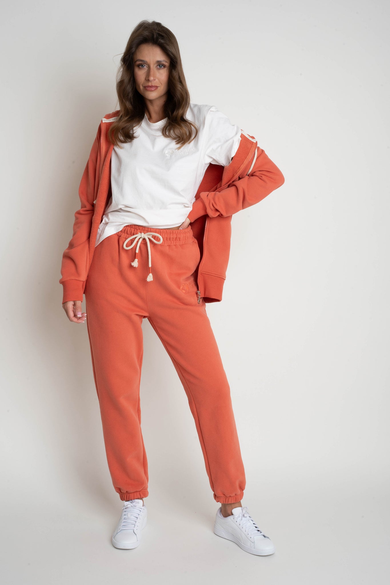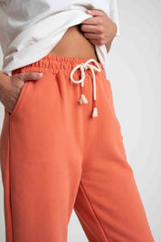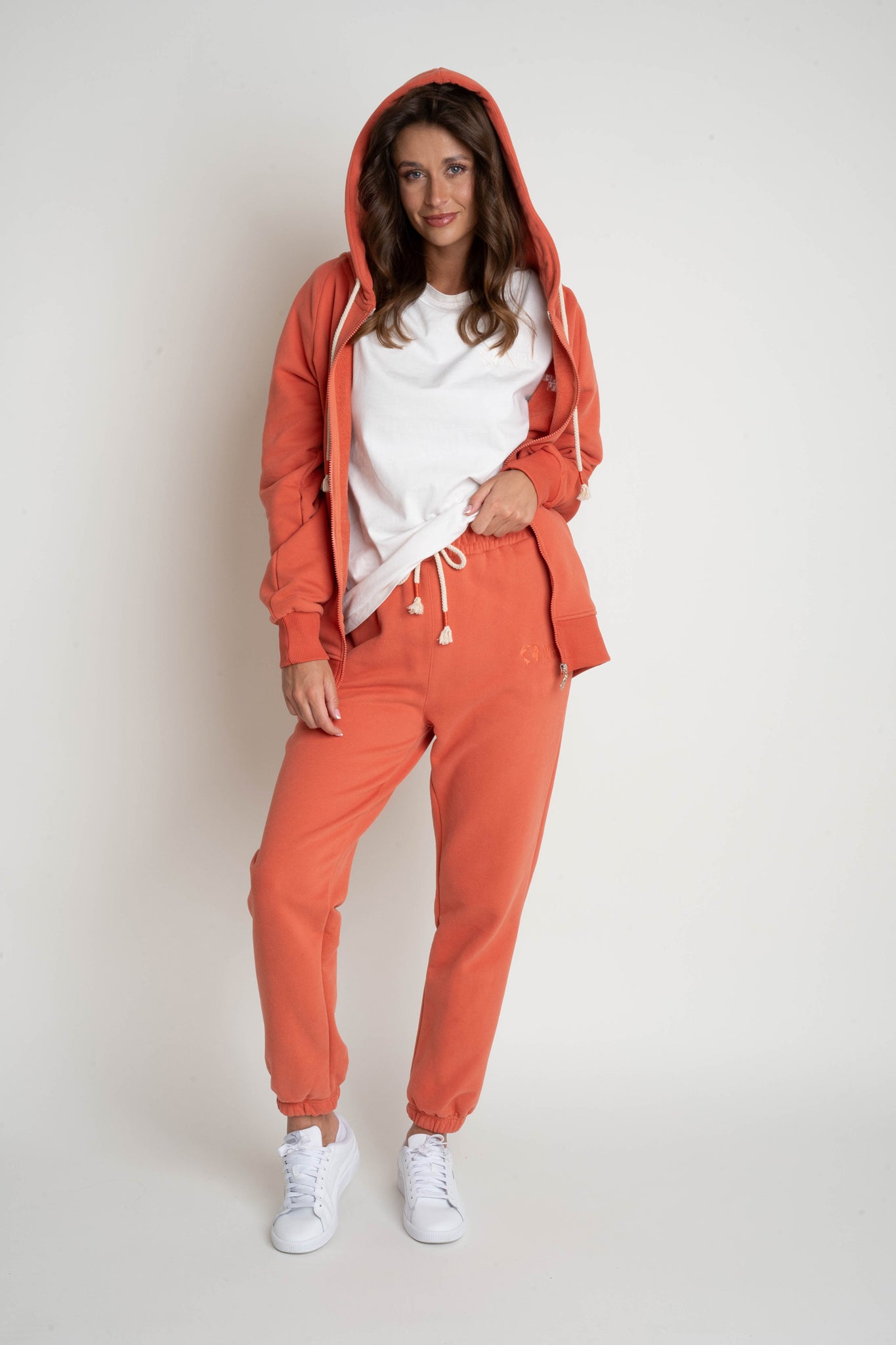 Spodnie uszyte są z naszej flagowej, grubej dzianiny 320g/m2, która nas wyróżnia. Jest ona gładka, ale przy tym bardzo mięsista. Od spodu posiada charakterystyczny splot diagonalny pokryty lekkim meszkiem, który w przyjemny sposób otula naszą skórę. Wierzchnia strona dzianiny także jest bardzo miła w dotyku, wykończona jest delikatnym meszkiem potocznie zwanym efektem brzoskwini, który nadaje jej wyjątkowej delikatności.