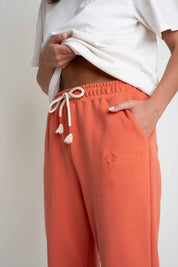 Milos to spodnie dresowe o bardzo klasycznym fasonie. Zapewniają pełną swobodę ruchów i wygodę. Mają miękką gumę w pasie oraz podobne gumy na nogawkach. W pasie jest bawełniany sznurek zakończony kolorowymi owijkami.