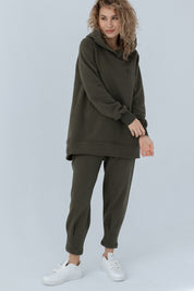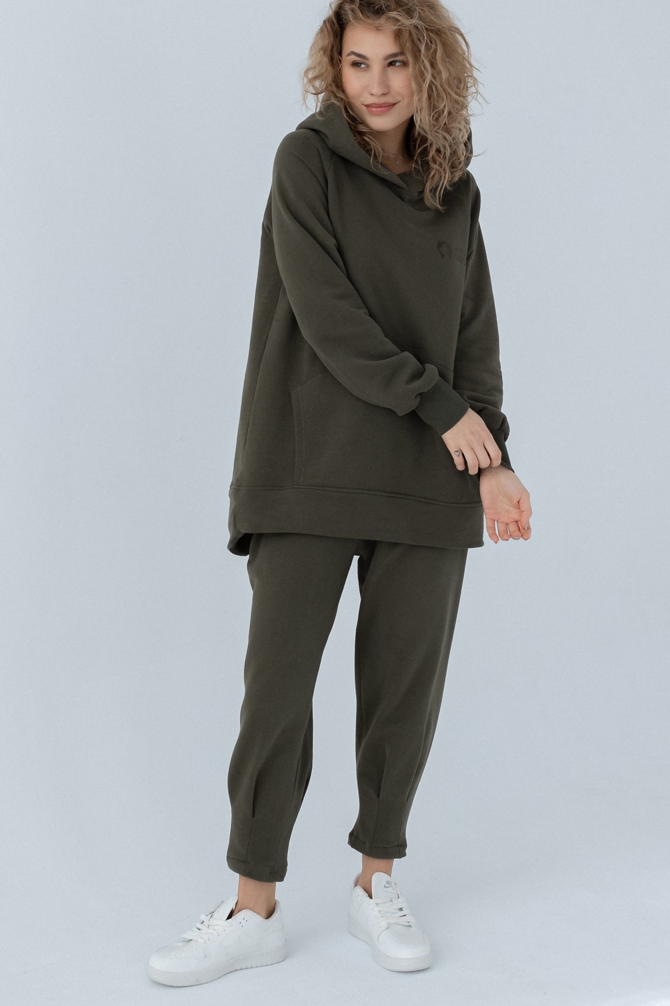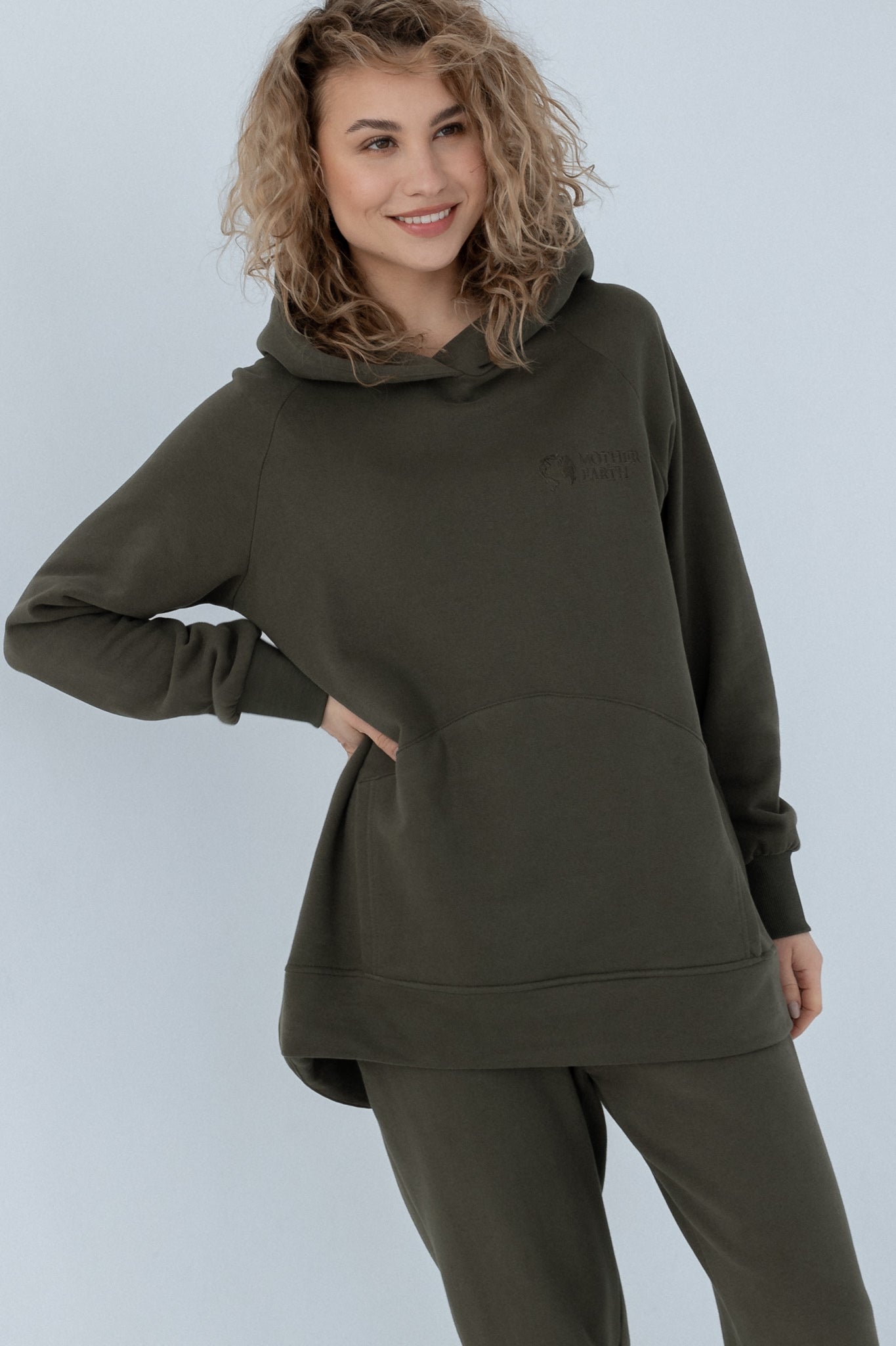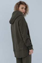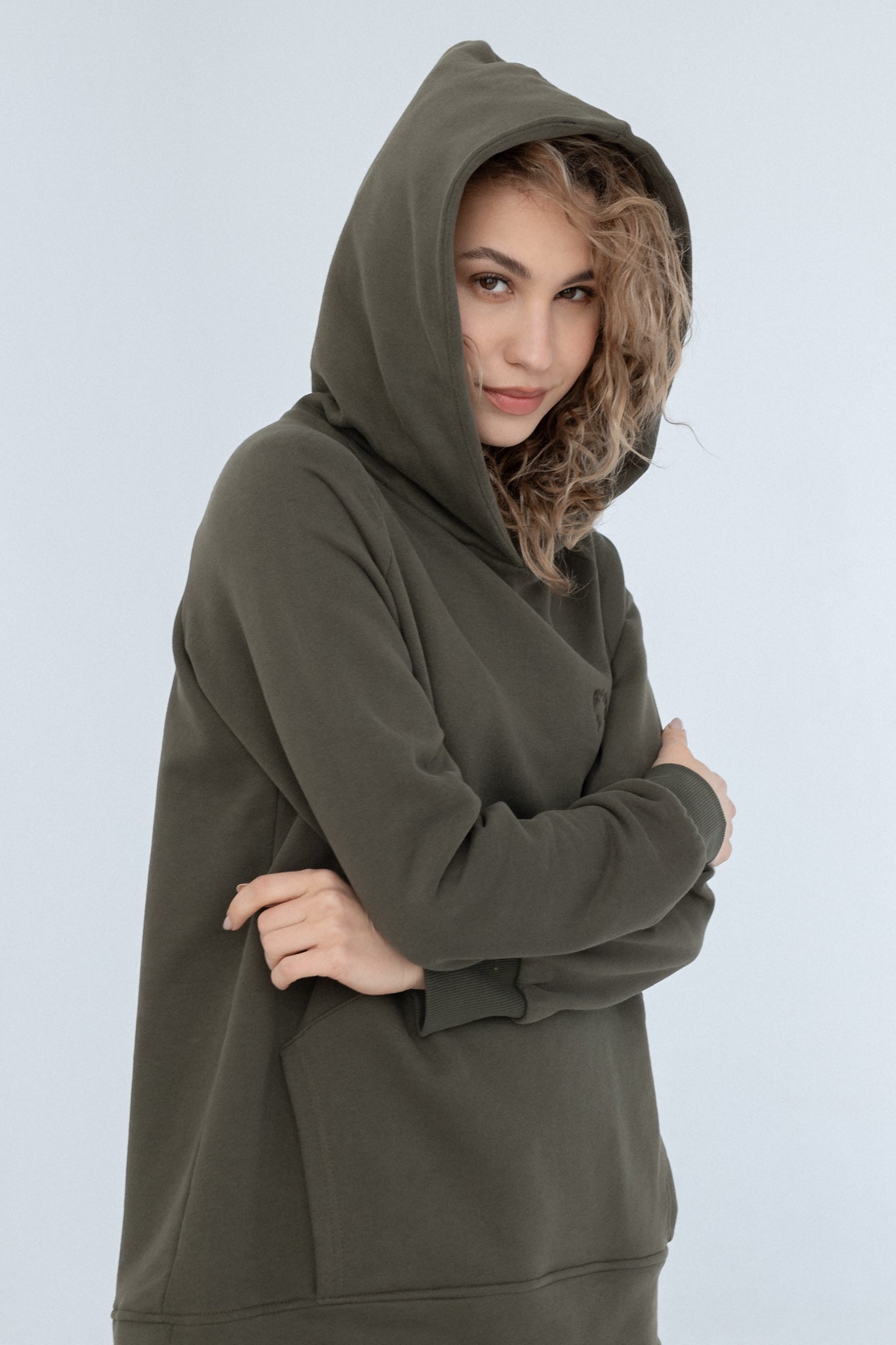DŁUGA ASYMETRYCZNA BLUZA Z KAPTUREM KHAKI - HALLA