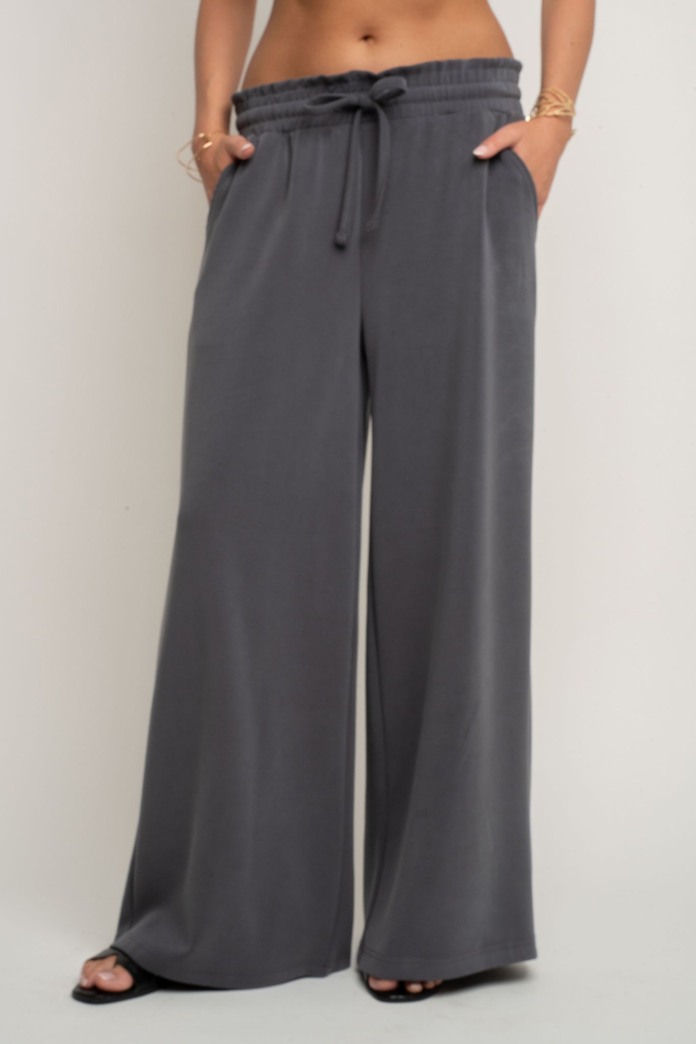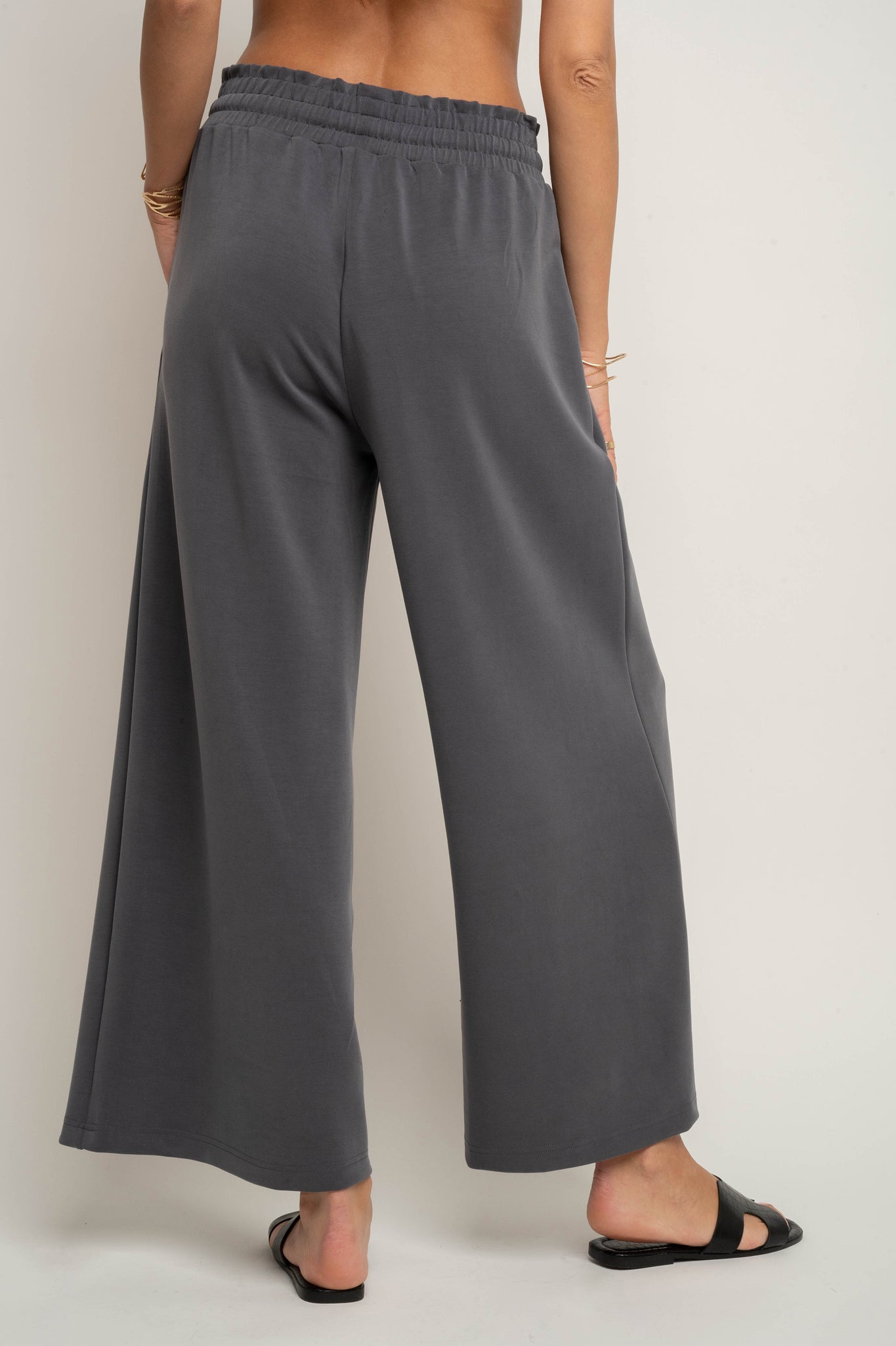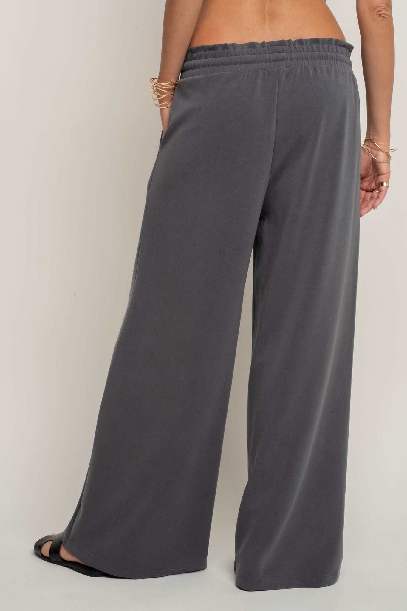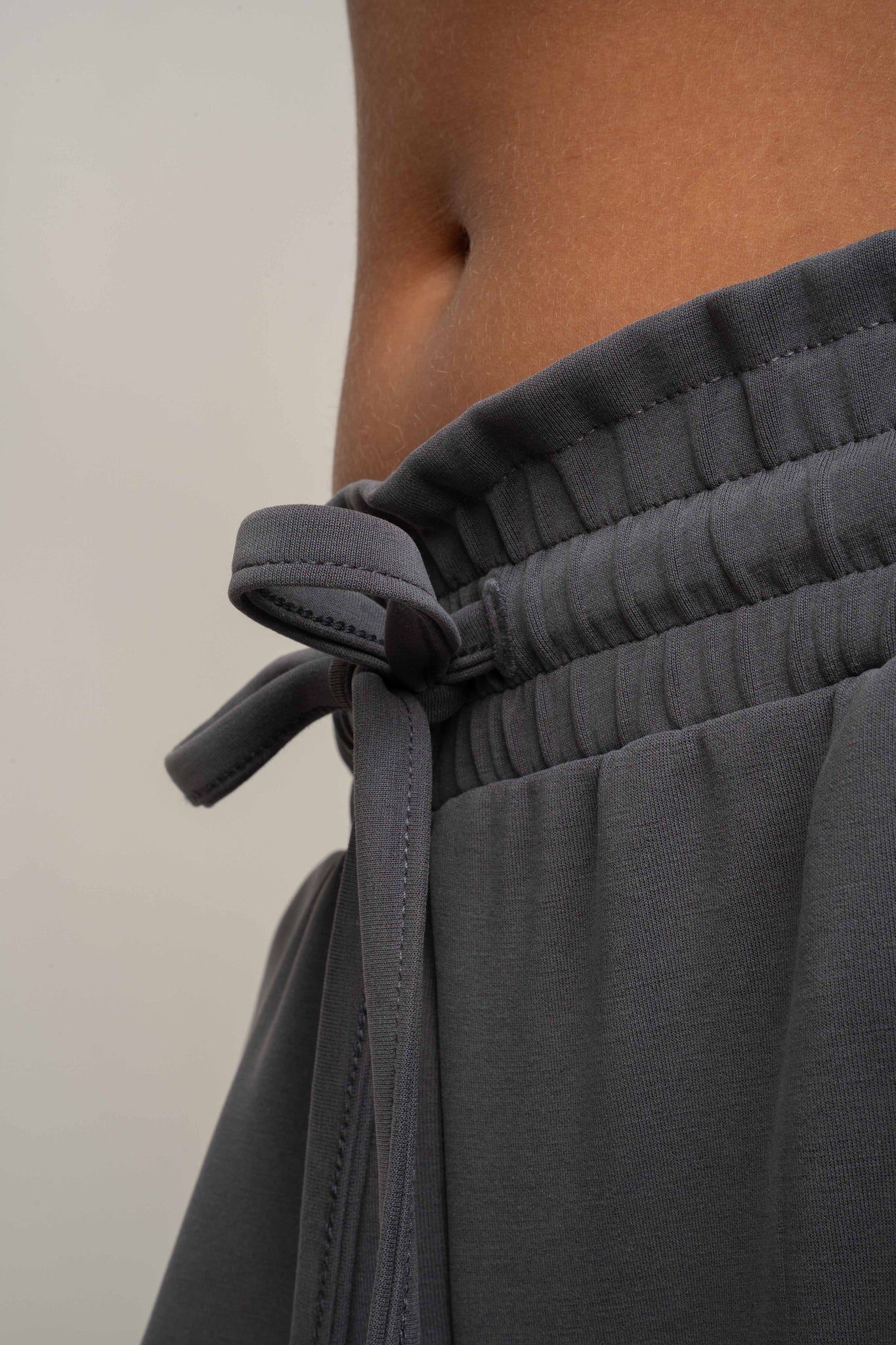 Te spodnie z modalu posiadają elastyczną gumę w pasie, która zapewnia doskonałe dopasowanie i komfort noszenia przez cały dzień. Dodatkowo sznurki do wiązania w kolorze spodni pozwalają na indywidualną regulację, a jednocześnie stanowią spójny, minimalistyczny detal. Pas pięknie układa się na sylwetce, delikatnie modelując brzuch i podkreślając talię.