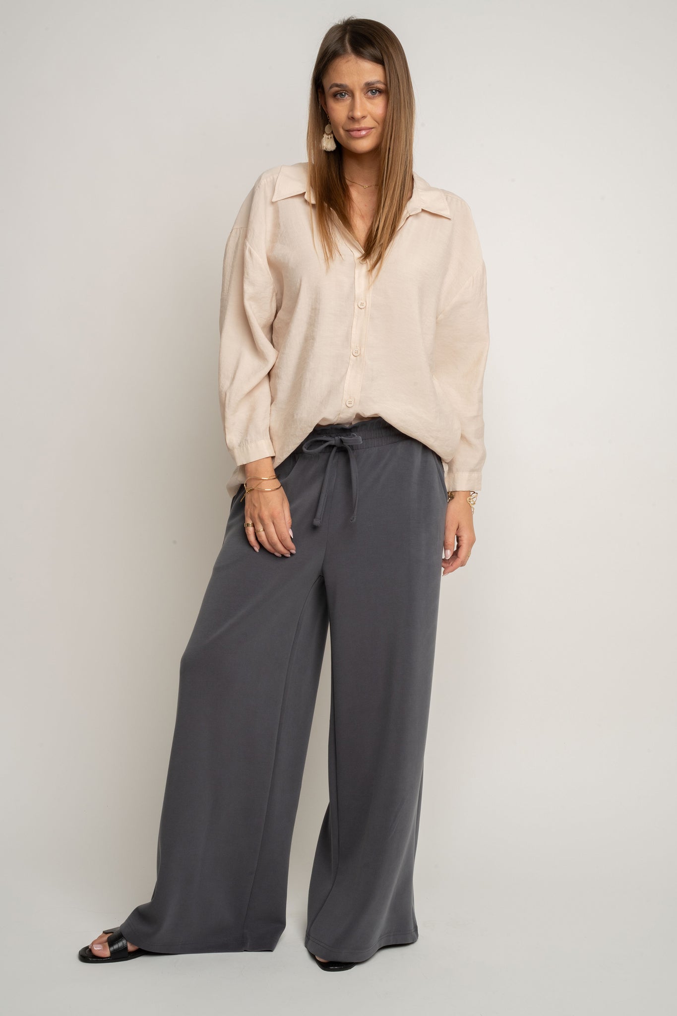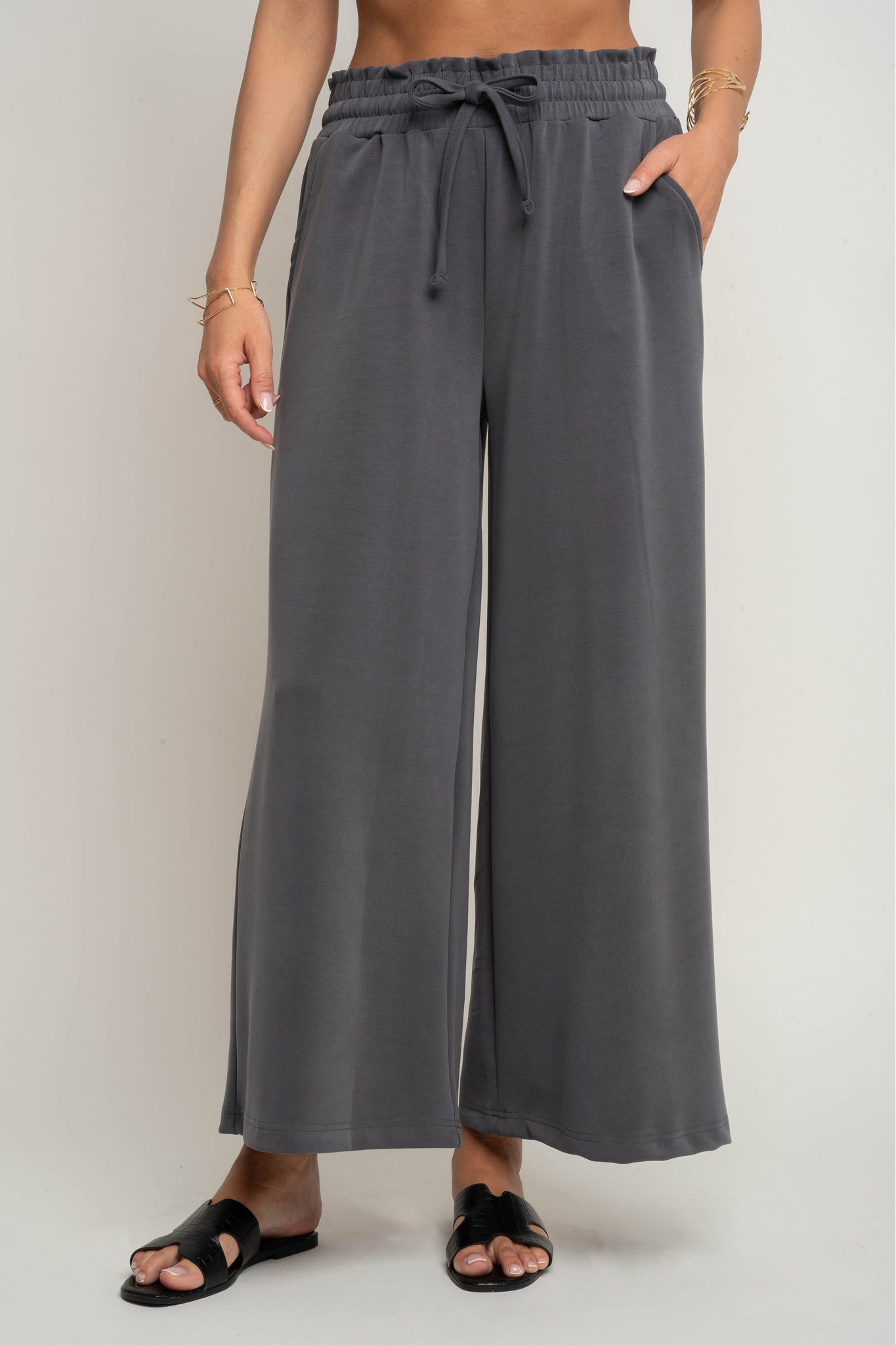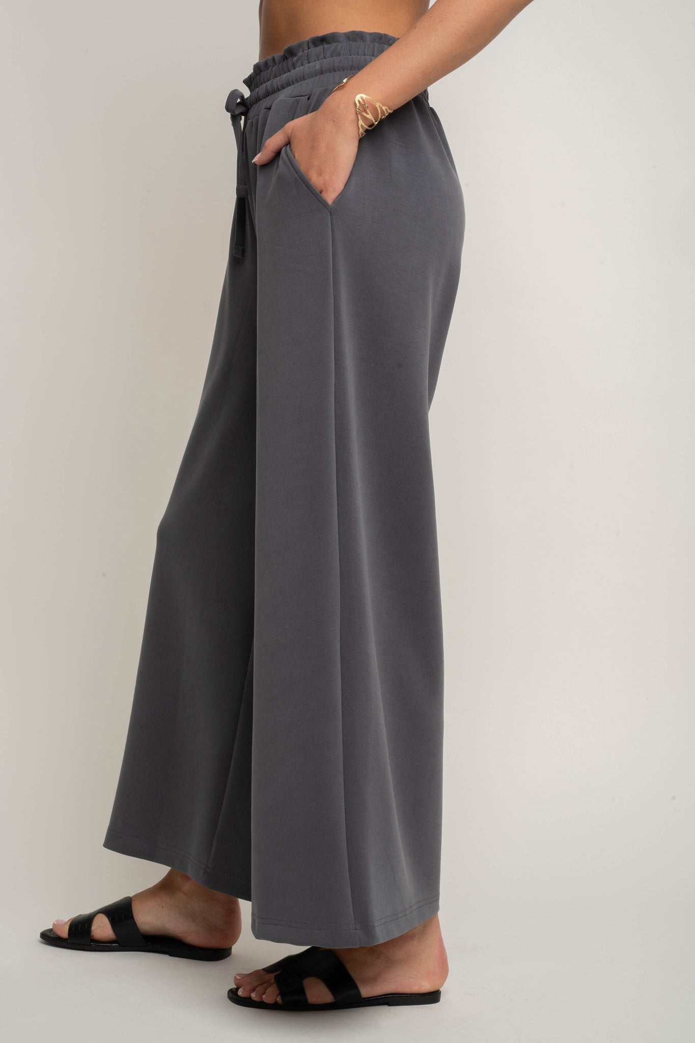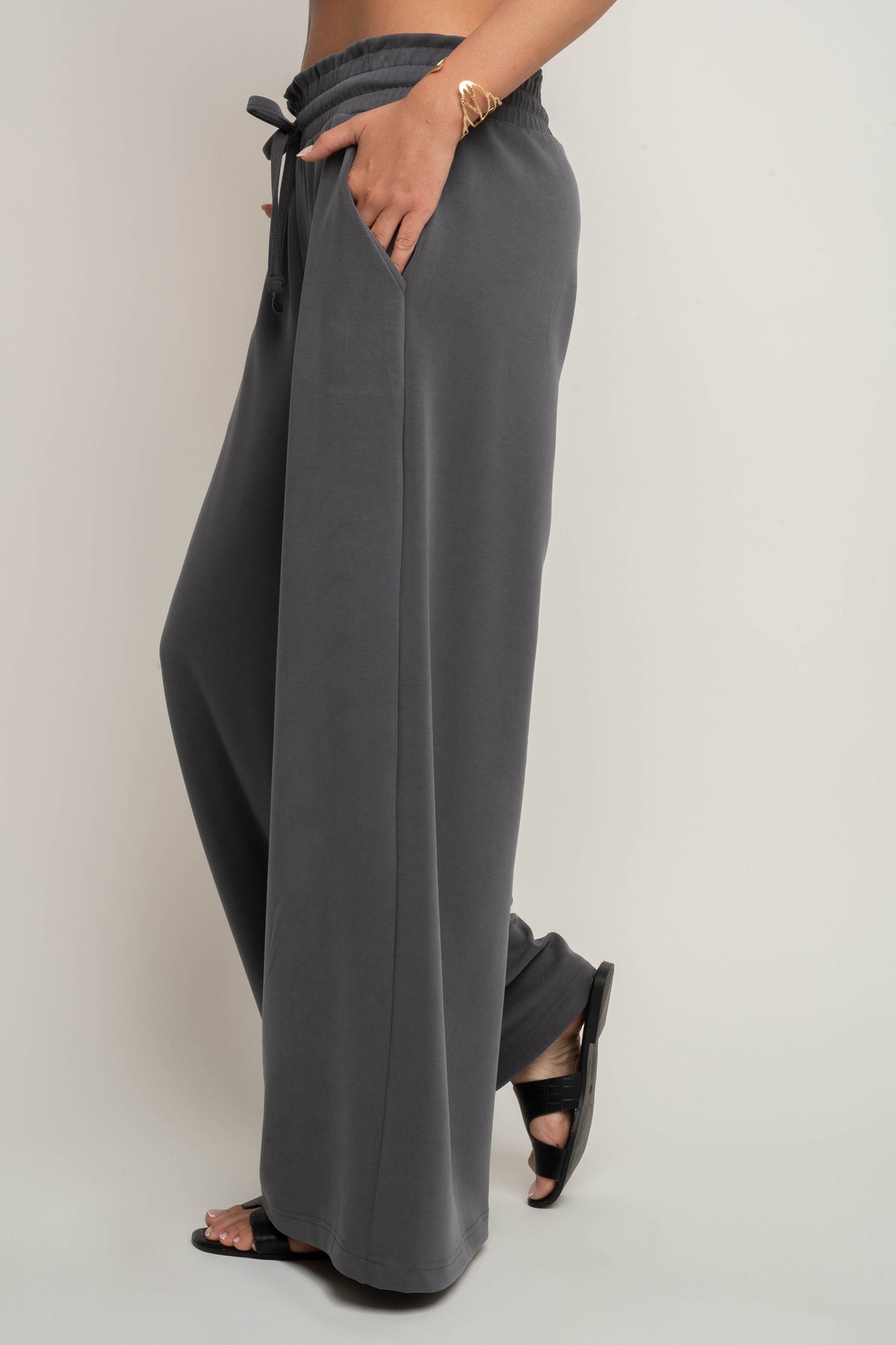 Te spodnie z modalu posiadają elastyczną gumę w pasie, która zapewnia doskonałe dopasowanie i komfort noszenia przez cały dzień. Dodatkowo sznurki do wiązania w kolorze spodni pozwalają na indywidualną regulację, a jednocześnie stanowią spójny, minimalistyczny detal. Pas pięknie układa się na sylwetce, delikatnie modelując brzuch i podkreślając talię.