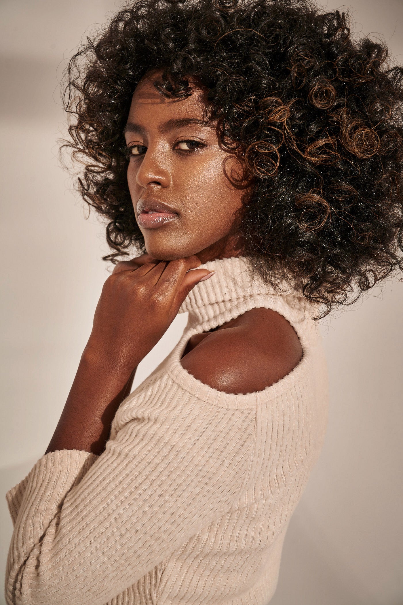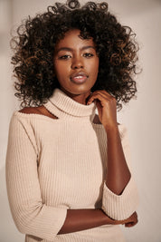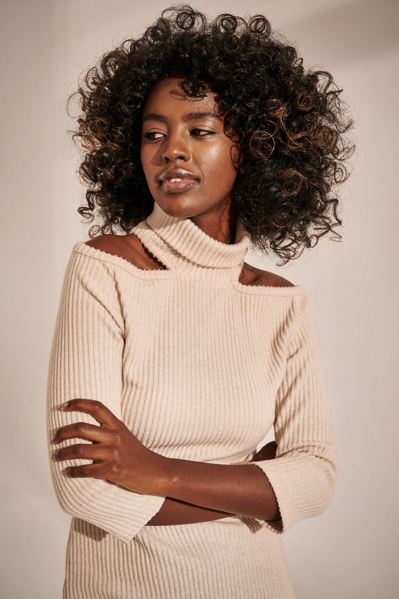 Krakatau is a dress with an interesting and unique cut. It's simple and form-fitting. It features ¾-length sleeves and a warm turtleneck. This style's distinctive features include cutouts on the shoulders, which allow for a revealing view of the skin and arms, and also serve as a unique embellishment. The dress is made of a ribbed fabric that is stretchy and flatters any figure.