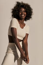 The T-shirt is tight, pleasantly hugging the skin. What makes it stand out is the beautiful neckline with a cutout in the shape of the letter "U".