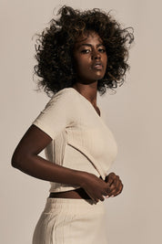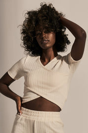 Skye is a unique T-shirt with a beautiful front. Two parts of the material overlap diagonally, which creates a unique construction. The T-shirt is short, fits close to the body. It has a delicate V-neck and short sleeves. It is very original, it will give any styling a bit of extravagance. It is made of a delicate material with a wide stripe structure.