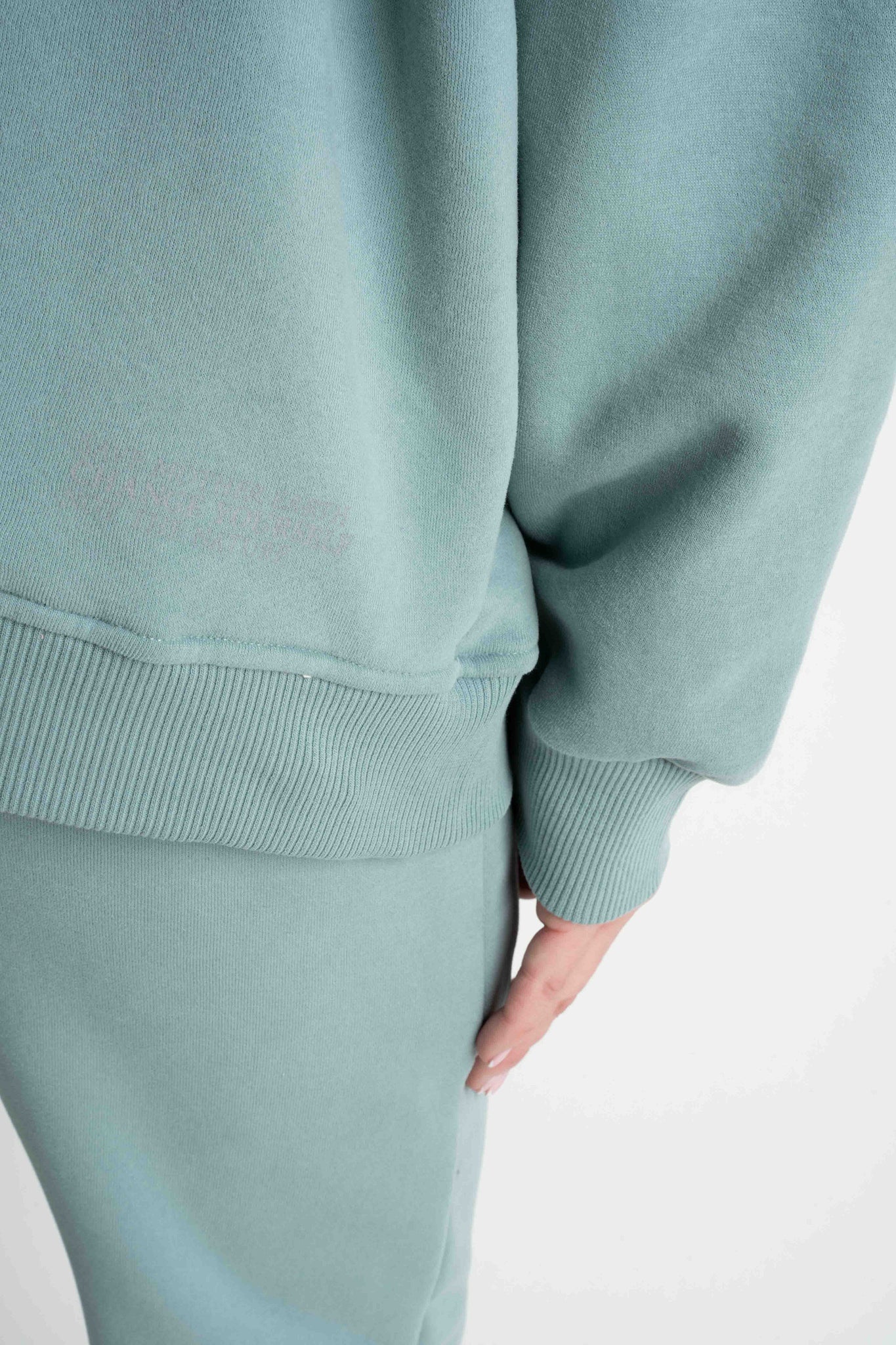 Bluza uszyta jest z naszej flagowej, grubej dzianiny, która nas wyróżnia. Jest ona gładka, ale przy tym bardzo mięsista. Od spodu posiada charakterystyczny splot diagonalny pokryty lekkim meszkiem, który w przyjemny sposób otula naszą skórę.