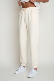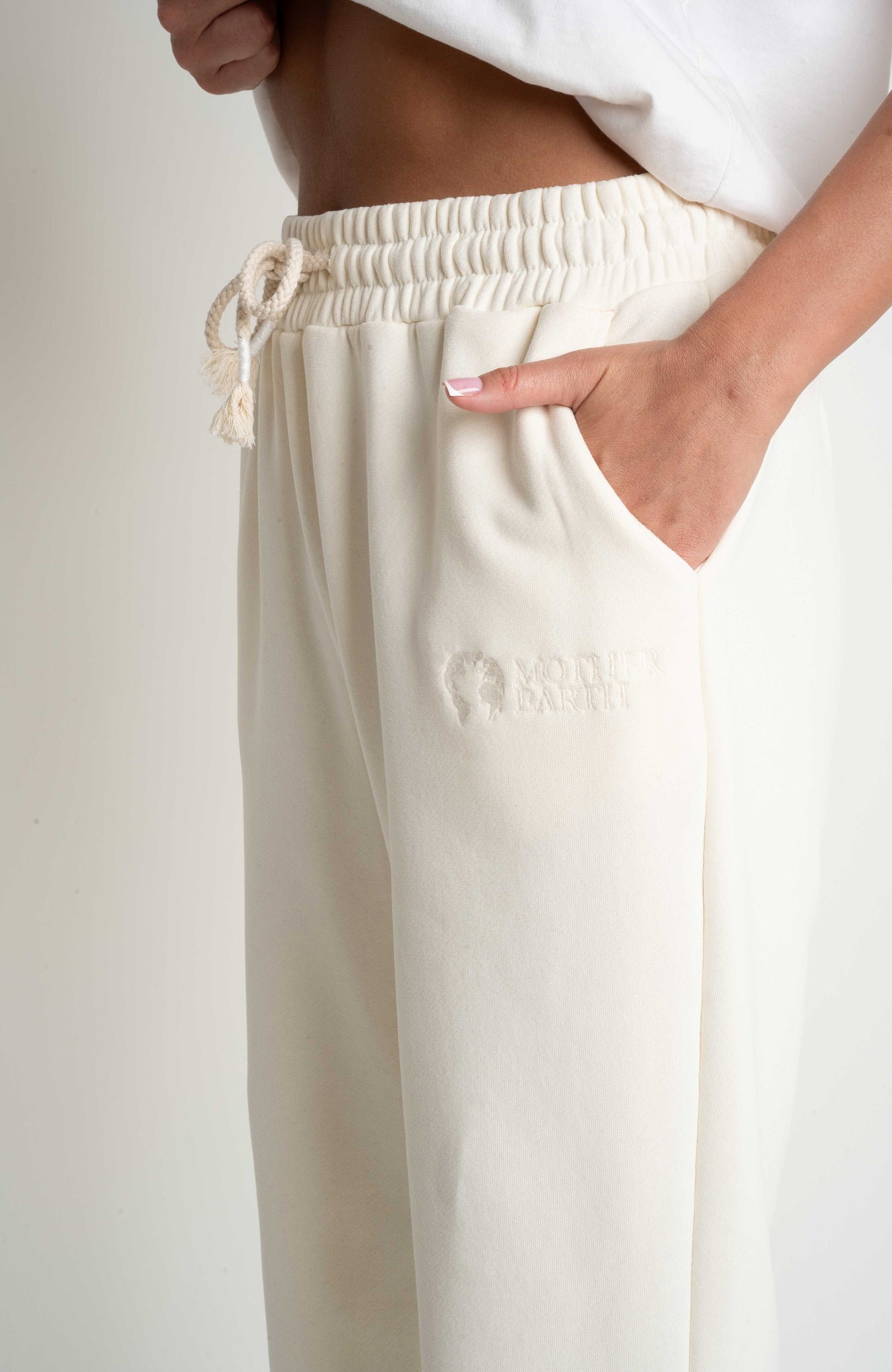 Spodnie uszyte są z naszej flagowej, grubej dzianiny 320g/m2, która nas wyróżnia. Jest ona gładka, ale przy tym bardzo mięsista. Od spodu posiada charakterystyczny splot diagonalny pokryty lekkim meszkiem, który w przyjemny sposób otula naszą skórę. Wierzchnia strona dzianiny także jest bardzo miła w dotyku, wykończona jest delikatnym meszkiem potocznie zwanym efektem brzoskwini, który nadaje jej wyjątkowej delikatności.
