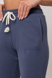 Spodnie dresowe o prostym kroju z wąskimi nogawkami z gumkami na dole. Dzięki gumkom spodnie można delikatnie podciągnąć, nabierają wtedy lekko zadziornego charakteru. Spodnie mają w pasie gumę oraz bawełniany sznurek zakończony ozdobnymi kolorowymi owijkami. Atutem spodni są wygodne i pojemne kieszenią, a pod jedną z nich znajduje się ozdobny haft w tym samym kolorze co dzianina. Spodnie świetnie wyglądają w zestawieniu z każdą praktycznie bluzą.