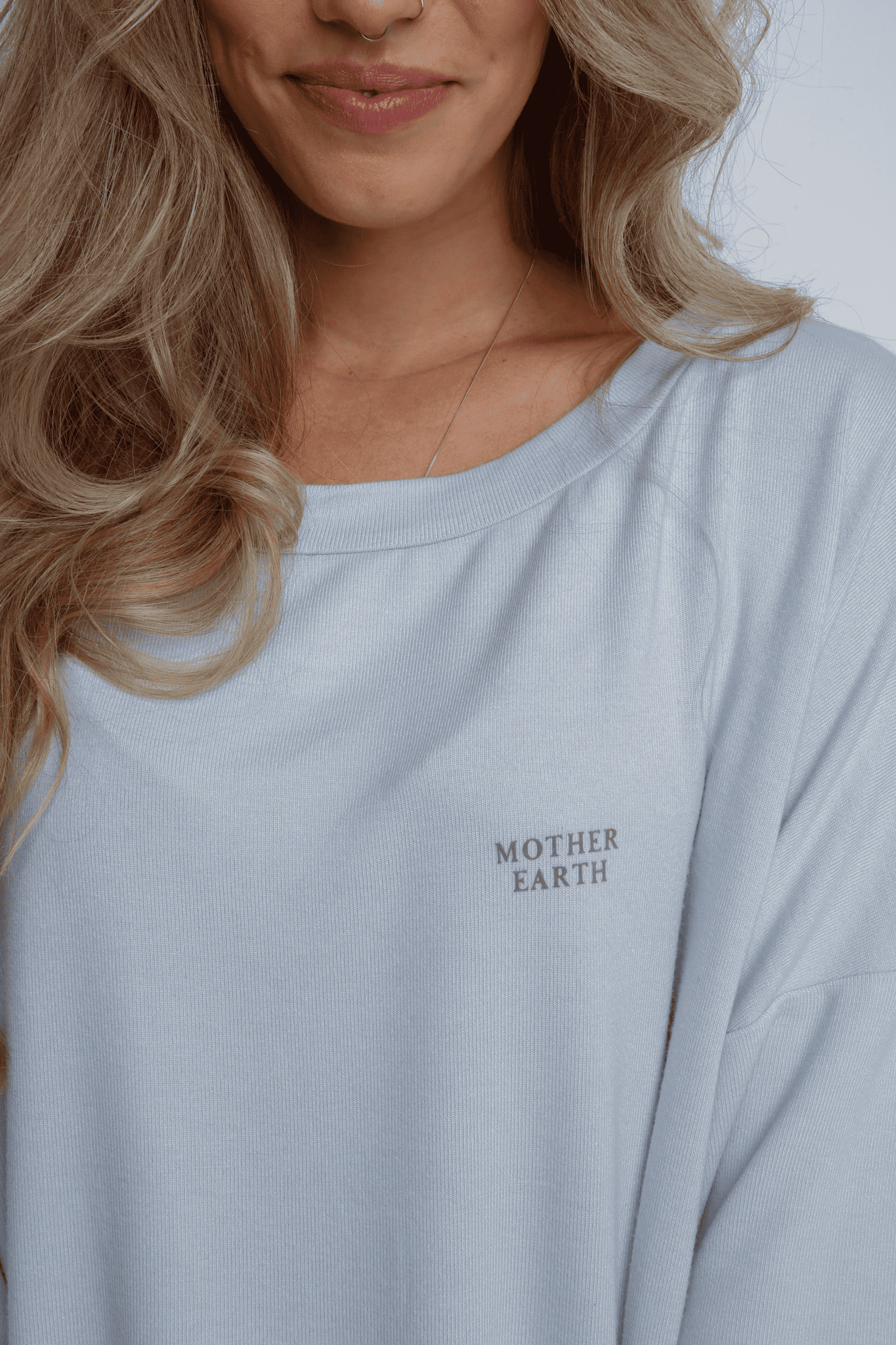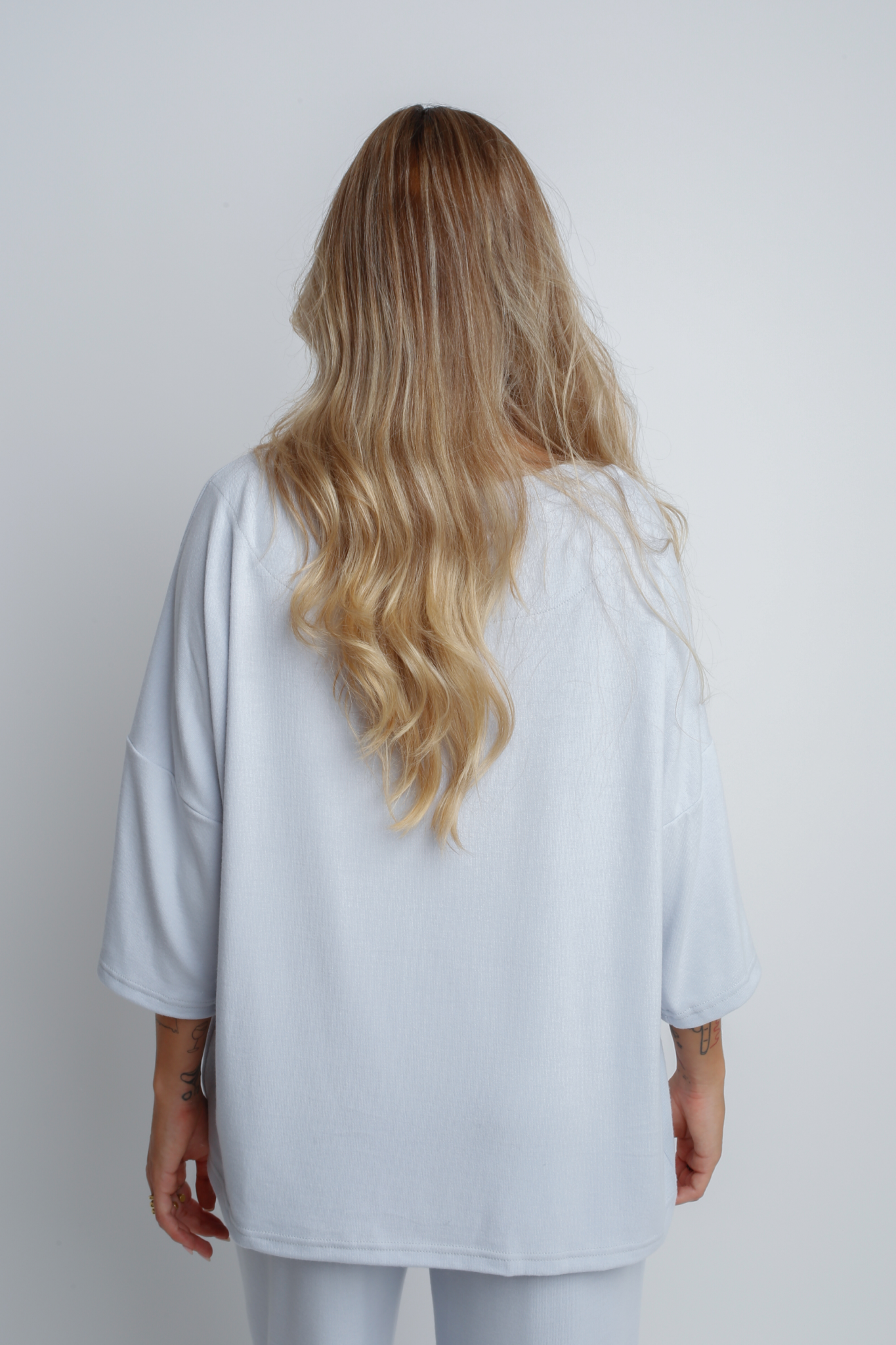Bluzka w fasonie oversize ma klasyczną długość i delikatnie opadające ramiona, co dodaje jej subtelnego uroku. Luźny, wygodny dekolt można nosić na dwa sposoby: klasycznie lub lekko opuszczony z ramienia, co daje możliwość tworzenia różnorodnych stylizacji. Na wysokości piersi znajduje się subtelne zdobienie, które dodaje elegancji i charakteru.